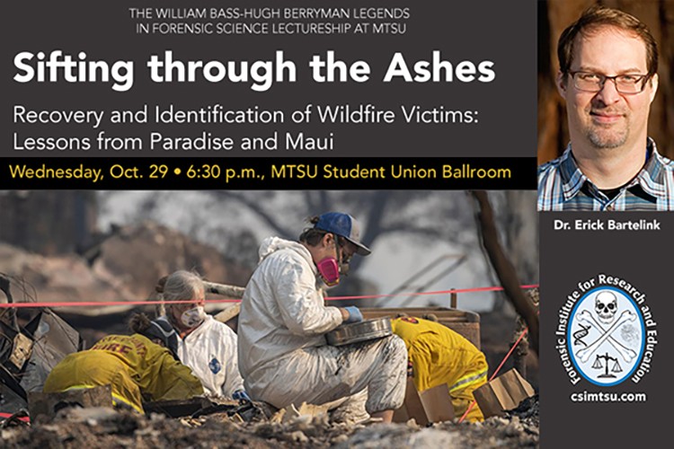 The public is welcome to attend Bartelink’s free “Sifting through the Ashes” presentation at 6:30 p.m. Wednesday, Oct. 29, in the MTSU Student Union Ballroom. It will focus mainly on his work recovering and identifying victims of the major wildfires in Paradise, California, and Maui, Hawaii. Bartelink will cap off his lecture with a Q&A.