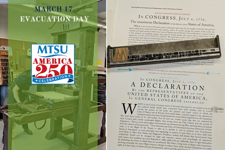 Middle Tennessee State University will commemorate Evacuation Day on Tuesday, March 17, with a hands-on historic printing experience and a public reading of the Declaration of Independence preamble.