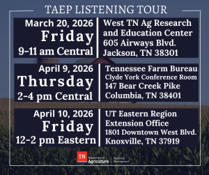 Farmers, agricultural organizations and community members are encouraged to attend and share their experiences and suggestions on how TAEP can best serve Tennessee agriculture.